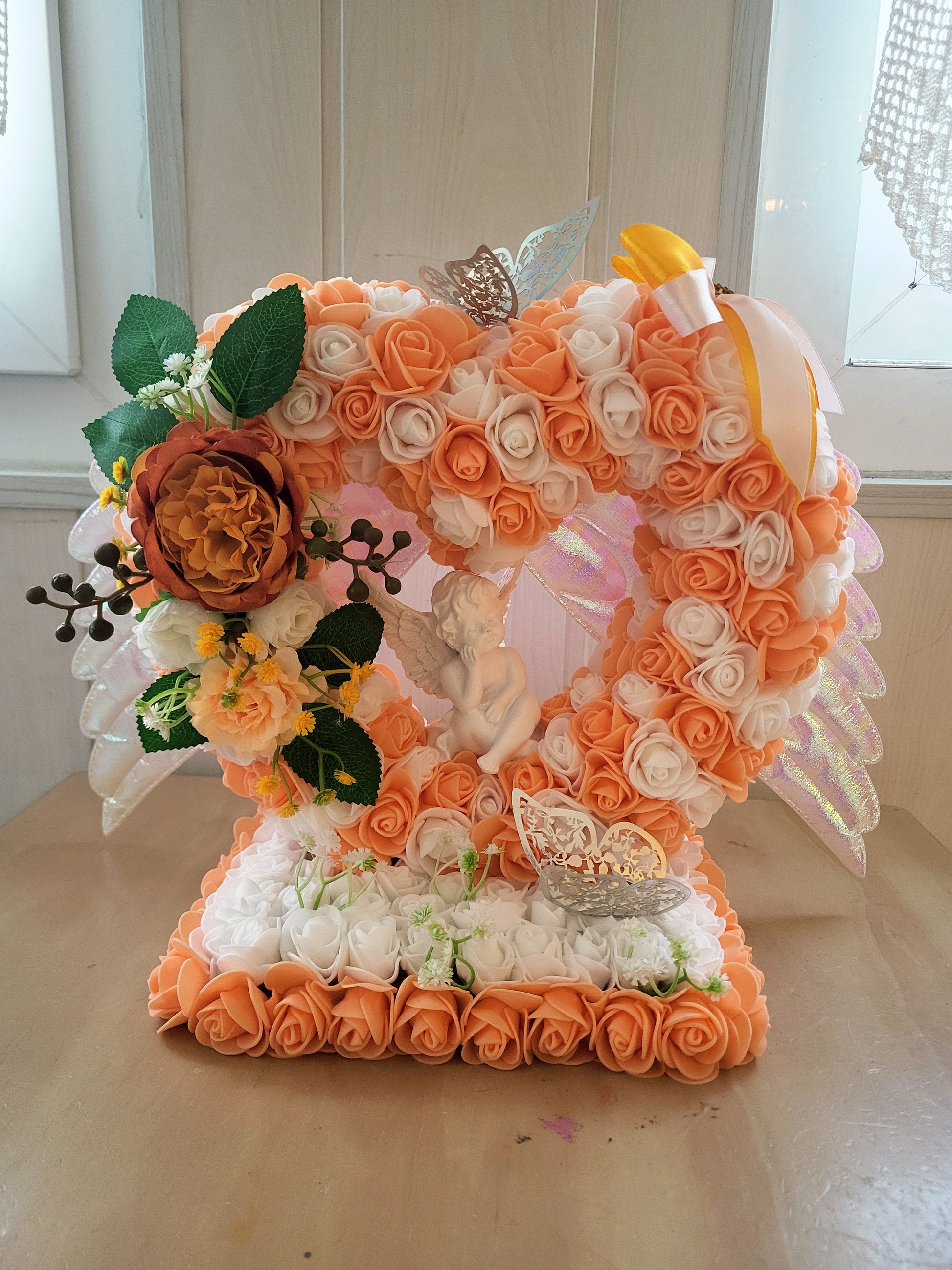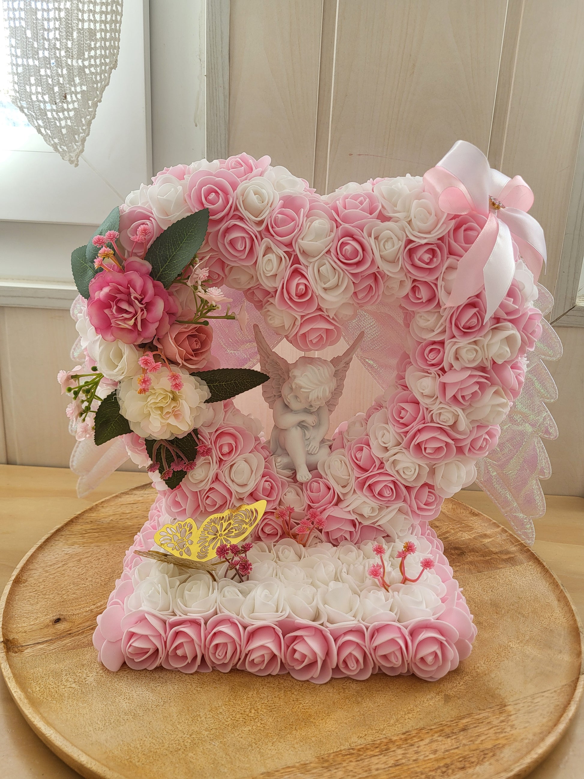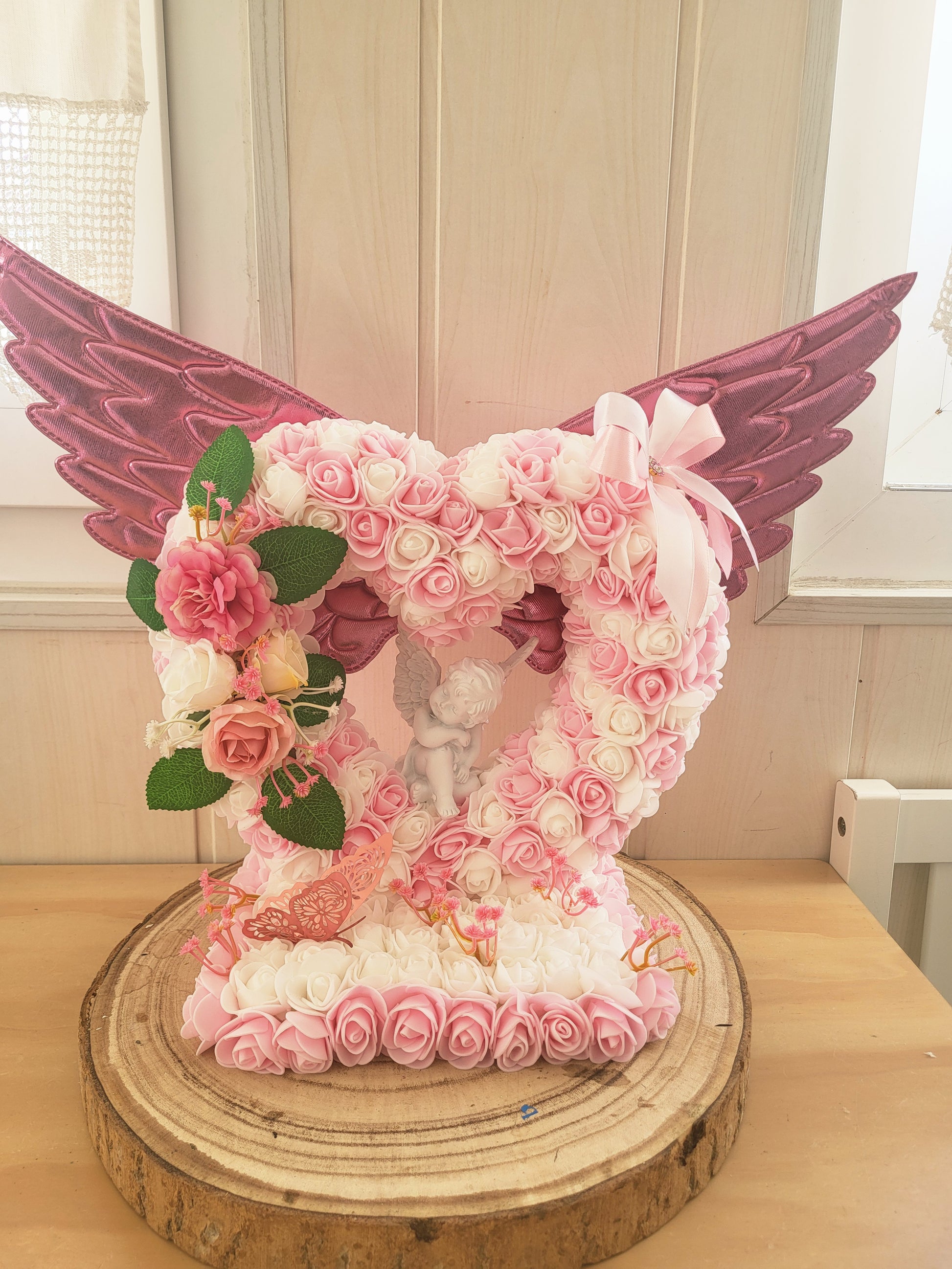 Indiquez moi la couleurs des fleurs et la couleurs des ailles et pour les anges vous avez blanc et dorée aussi et la personnalisation à y mettre dessus.