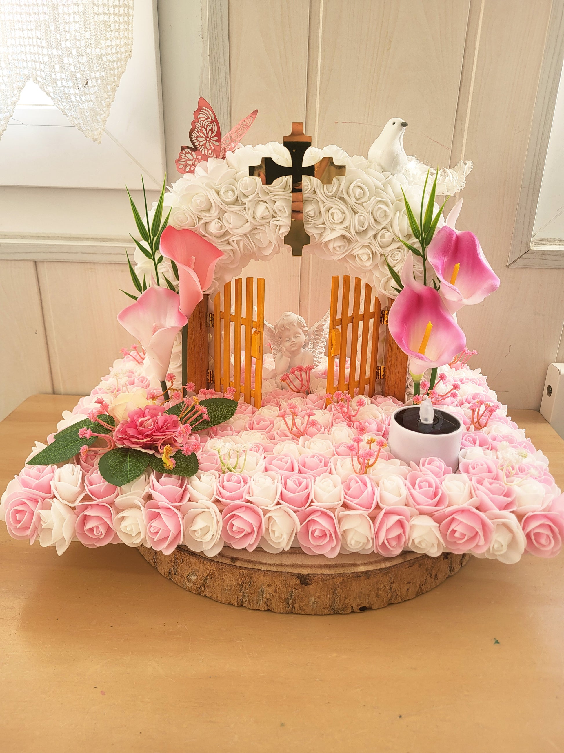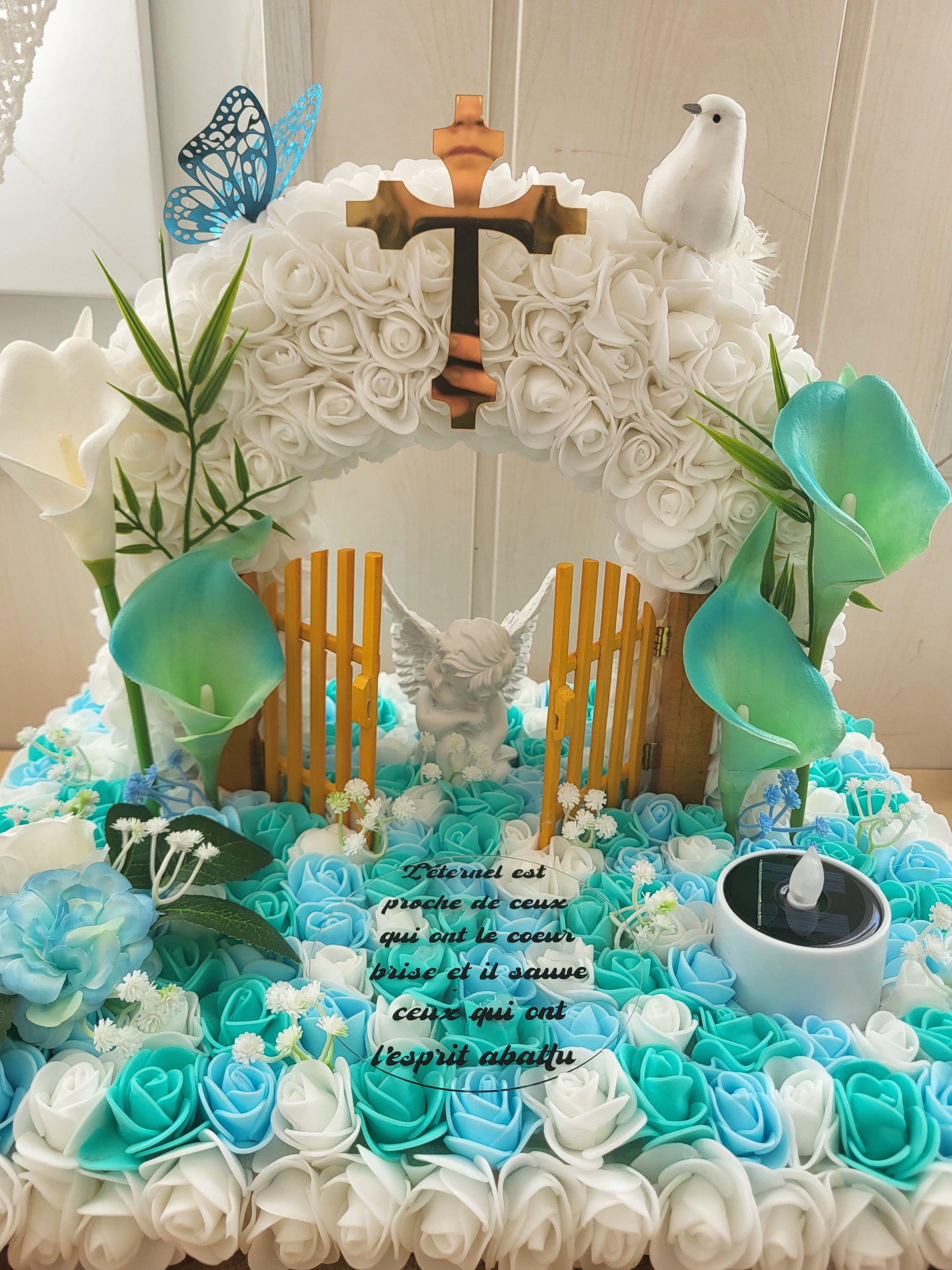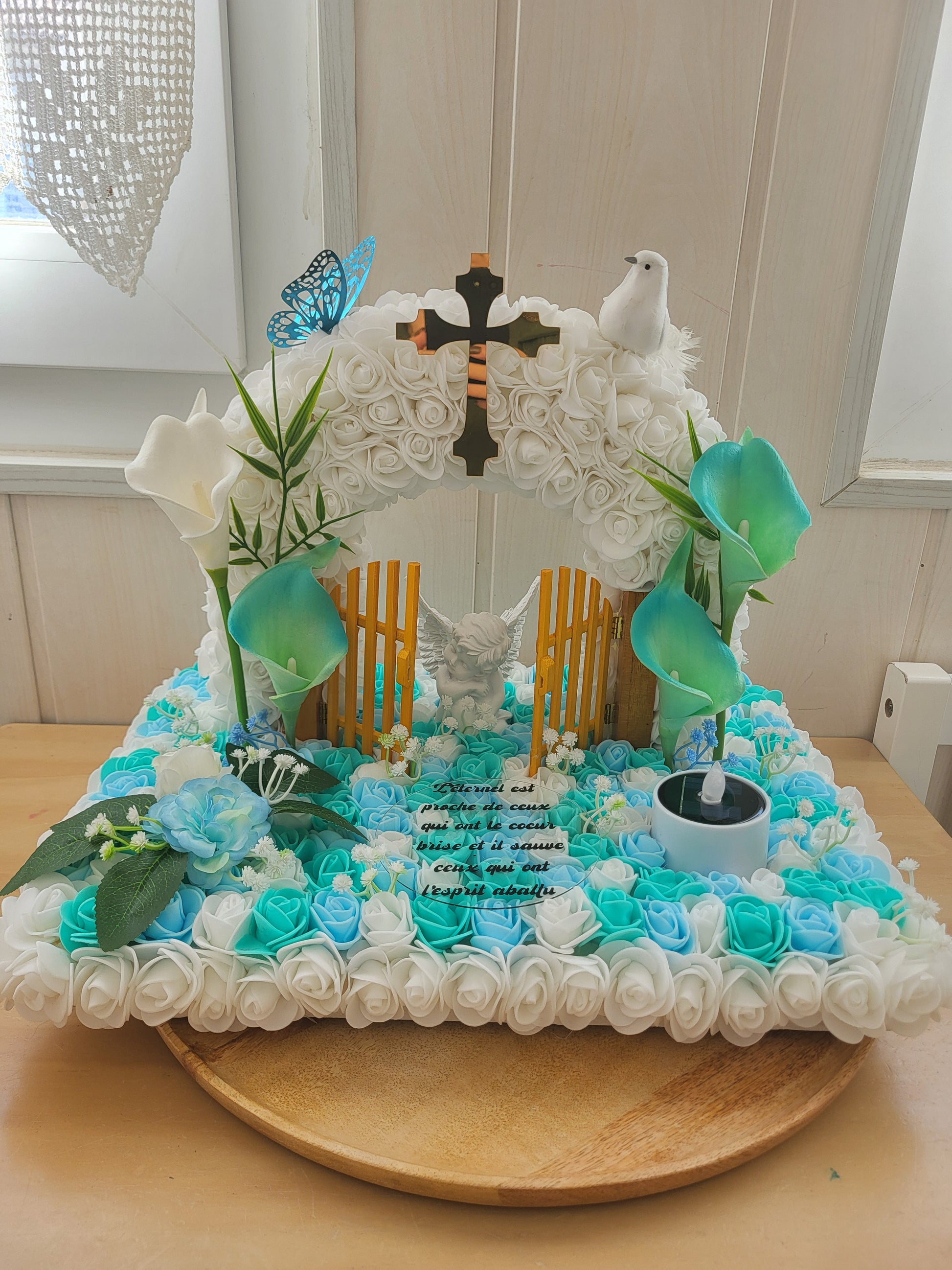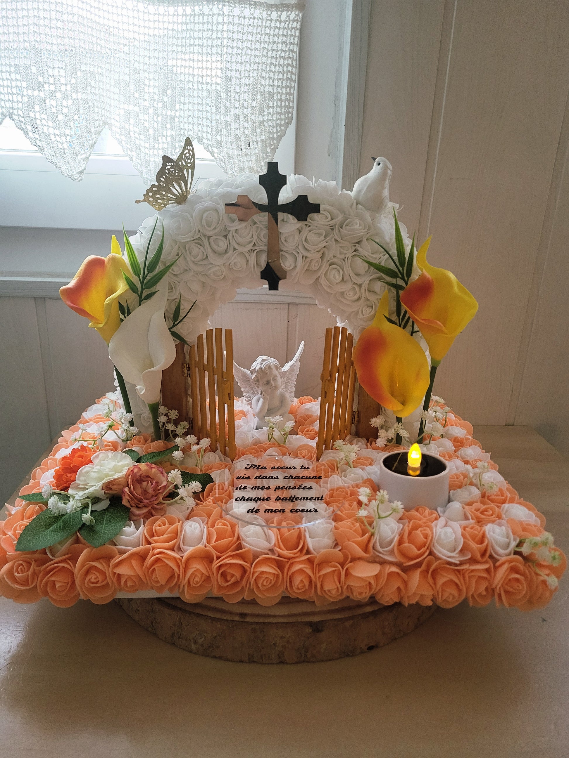Porte du paradis avec socle en bois et bougie solaires pour monuments funéraires a personnalisé.