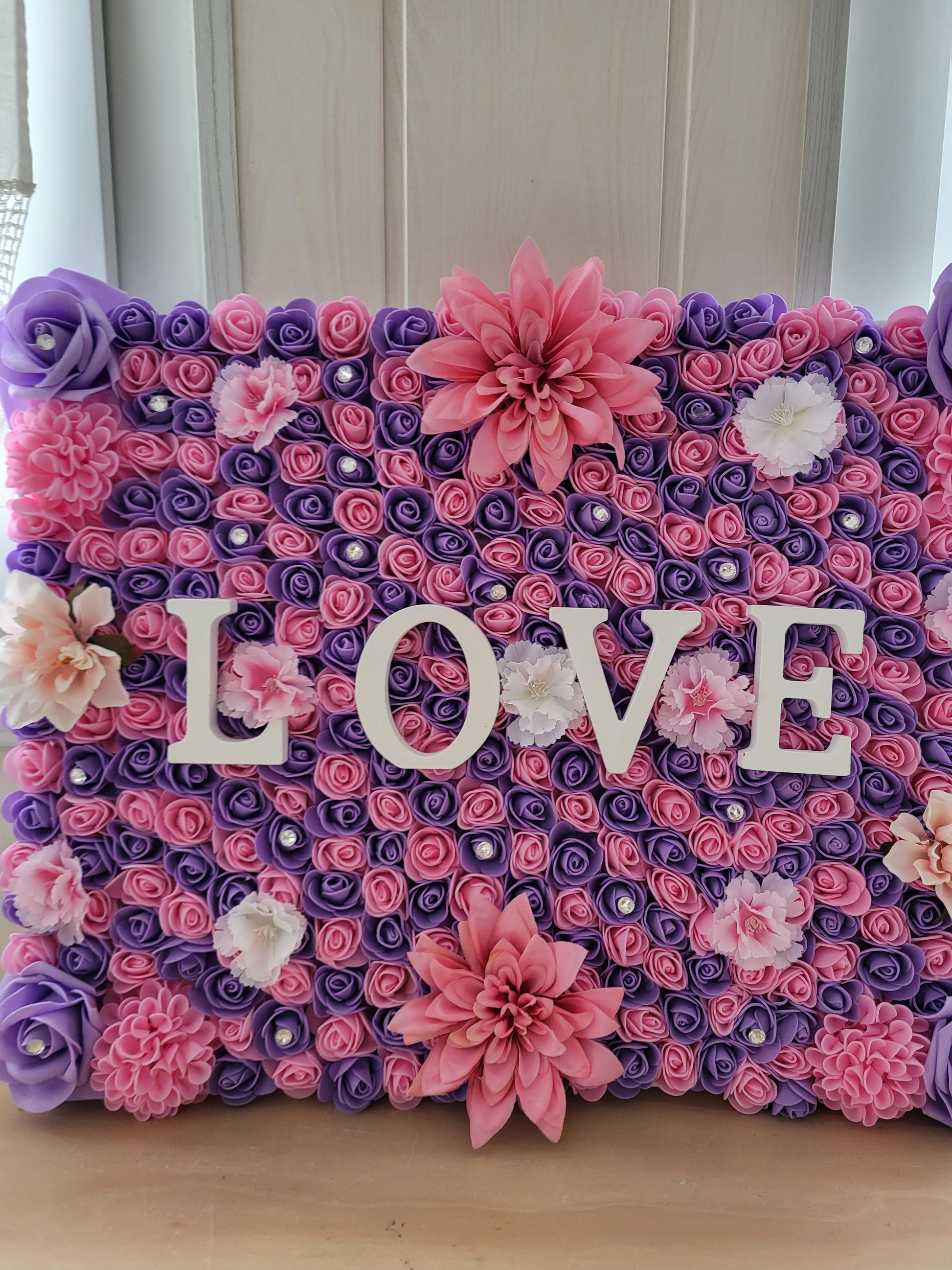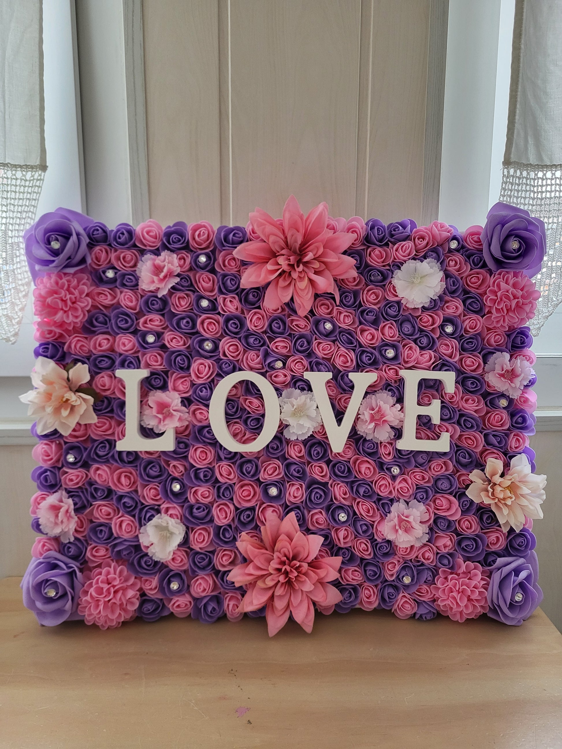 Toile fleuri à suspendre fleuri personnalisé avec la photo et le prénom recouverte avec des fleurs artificielles en mousse